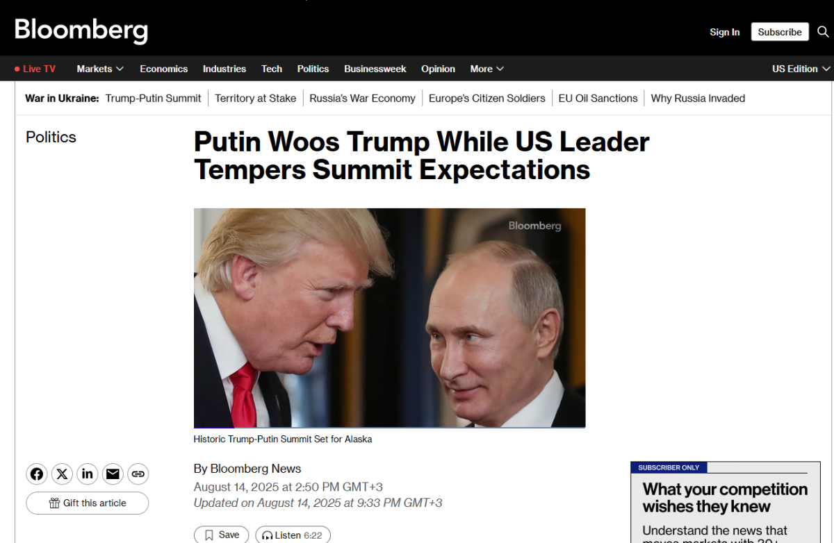 «Стремление Путина использовать обаяние перед тем, как он прибыл на американскую землю для личной встречи с американским президентом в пятницу, имело своей целью свести войну – самый смертоносный конфликт в Европе за несколько десятилетий – к всего лишь одной частности на пути к восстановлению связей между Вашингтоном и Москвой. Трамп, однако, стремился снизить градус надежд на прорыв, отчасти оставаясь задетым встречей с Путиным во время своего первого срока, которая воспринималась как конфуз американского президента».