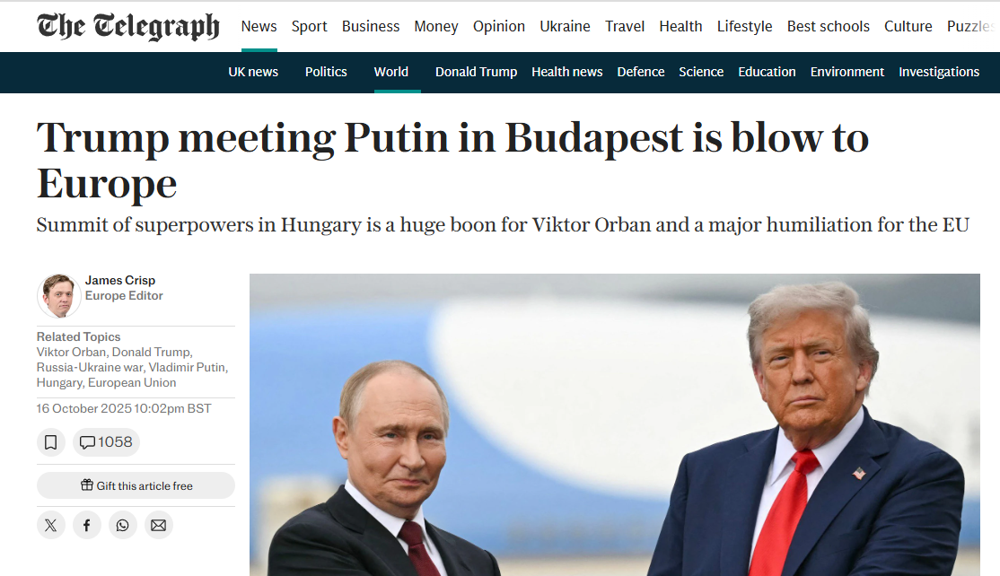 The Daily Telegraph (Великобритания). Встреча Трампа с Путиным в Будапеште – это удар по Европе