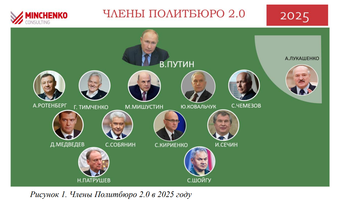 Состав «Политбюро 2.0» – модели, описывающей устойчивые группы в окружении Владимира Путина (по аналогии с Политбюро ЦК КПСС), – с момента выхода последнего доклада в июне 2024 года не изменился. В него входят помощник президента Николай Патрушев, секретарь Совета безопасности Сергей Шойгу, зампред Совбеза Дмитрий Медведев, главы «Ростеха» и «Роснефти» Сергей Чемезов и Игорь Сечин, столичный мэр Сергей Собянин, предприниматели Юрий Ковальчук, Геннадий Тимченко и Аркадий Ротенберг, а также (в качестве «ассоциированного члена») президент Белоруссии Александр Лукашенко.