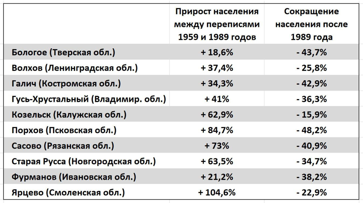 За последние советские десятилетия прирост населения в этих городах составил в среднем 54,1%. Это не такой быстрый рост, как в крупных городах (население советской Москвы с 1959 по 1989 год выросло на 74,5%), но всё-таки эти данные предельно ясно показывают: в советское время малые города успешно развивались. А вот в годы капитализма почти все малые города России начали стремительно вымирать. Средняя потеря населения по этим 10 городам – 34,9%, то есть больше трети!